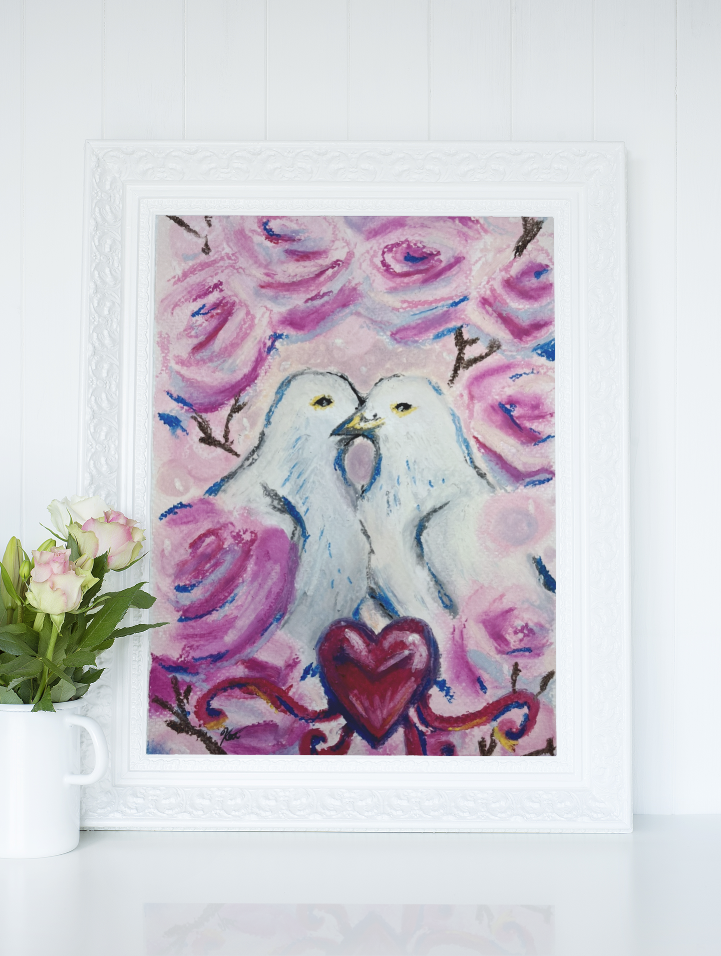 Impression d'une œuvre de pastels à l'huile que j'ai réalisé, inspiré par les colombes et l'amour qui dure, qui nourrit, qui protège.💗